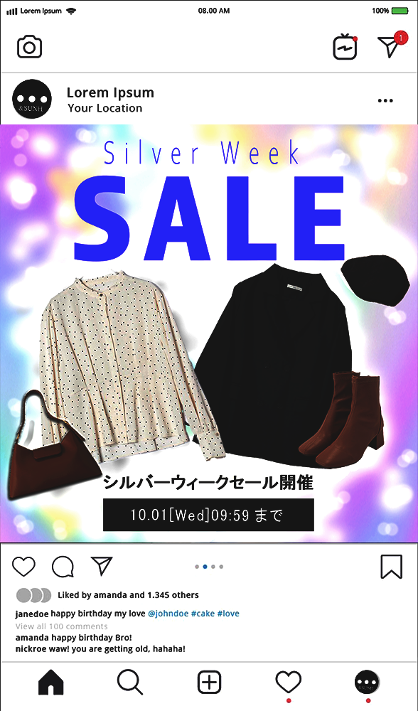 | デザインコンセプト | 30代会社員を対象にシルバーウィークに行うセールの告知。フルコーデできるよう、全身アイテムがセールの対象になっている。 |